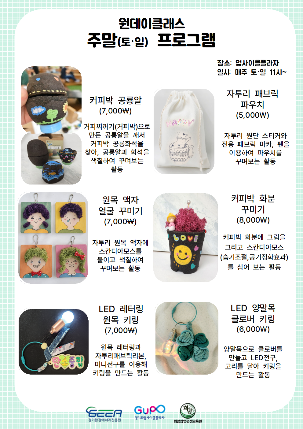 해당 프로그램은 매주 주말(토,일)마다 진행되며, 매달 다른 체험 프로그램으로 구성됩니다. 당일 접수도 가능합니다. 관심있으신 분은 업사이클 플라자로 오셔서 체험해보고 가세요~